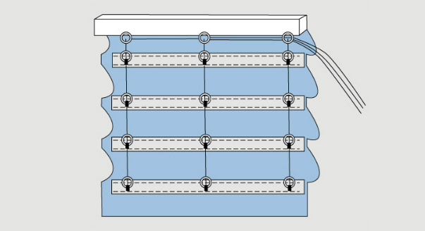 Романская жесткая складка шьется с помощью горизонтальных перекладин, поэтому она хорошо держит форму и является самой популярной среди складок римских штор.