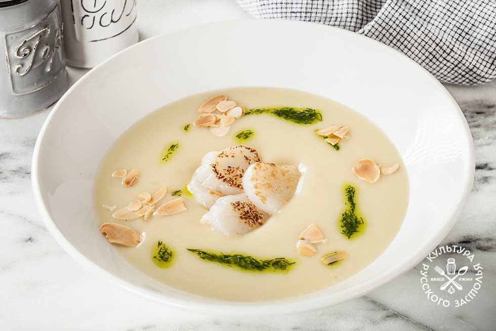 Готовые гребешки разрезать вдоль пополам. - В суповую тарелку налить холодный крем-суп, в центр аккуратно выложить гребешки.