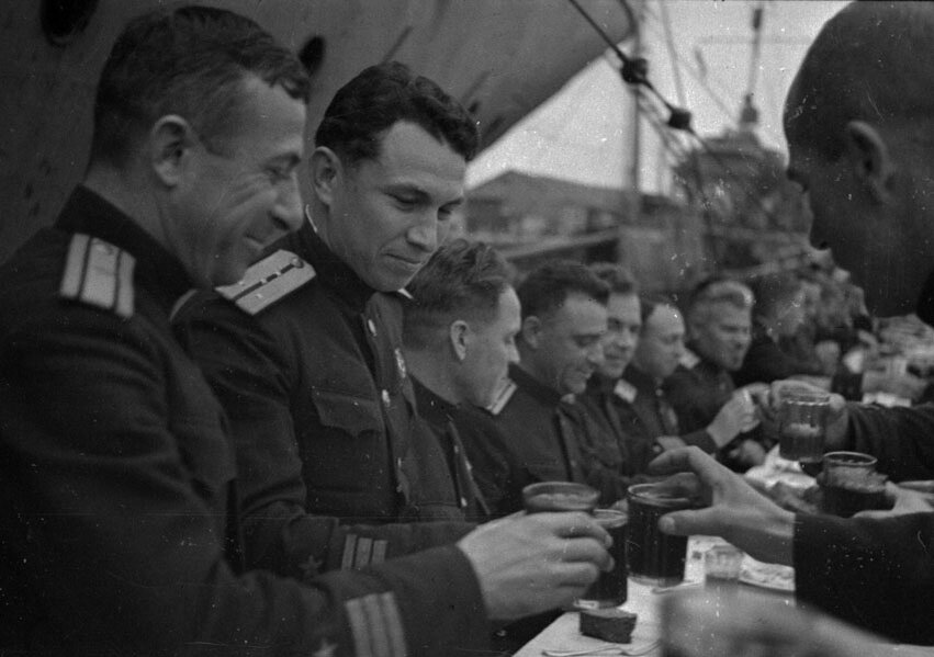 Прямо на палубе , под "живую" музыку мужики отмечают свой боевой успех. Лица , парадная форма , скромный праздник ... и ни каких "горбачёвых" на них нет! Заработала обратная связь : один из читателей поделился точной атрибуцией этих снимков. Спасибо ему и теперь мы знаем : На палубе С-31 начальник ПО БПЛ капитан 3 ранга С.И. Пастухов, командир лодки капитан-лейтенант Н.П. Белоруков, X, командир БПЛ капитан 1 ранга А.В. Крестовский, командир 1 ДПЛ капитан 2 ранга Н.Д. Новиков, заместитель НШ БПЛ капитан 2 ранга Б.А. Успенский, помощник командира БПЛ по тылам подполковник М.С. Кулик, торжественный обед после похода, конец октября 1943г.