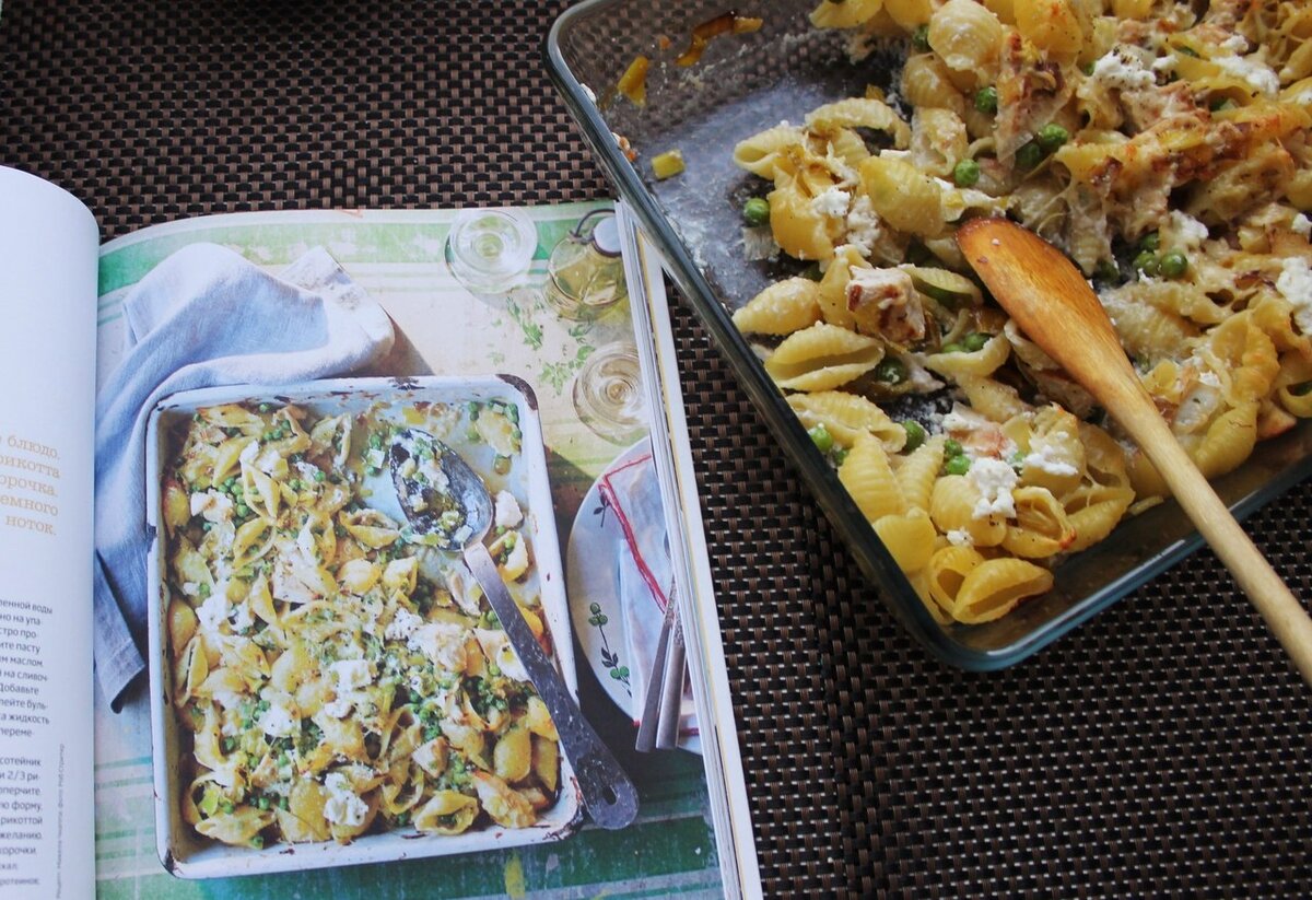 Из простых ракушек сделаем вкусное необычное блюдо, запечём их вместе с чудесным луком-пореем, нежнейшей рикоттой, курицей, зелёным горошком и сыром, будет очень вкусно и небанально. Рецепт прочитала в книге рецептов от Джейми Оливера, продукты доступные, а сочетание потрясающее. Ингредиенты на большой противень, хватит всем. Нам потребуется: Паста «Ракушки», 350 г Лук-порей, 2 шт (у меня 1 большой) Куриное мясо отварное или запечённое, 200 г Куриный бульон, 100 мл Белое вино, 100 мл Зелёный горошек, 150 г (у меня замороженный) Рикотта, 250 г Молоко, 220 мл Твёрдый сыр, 60 г Чеснок, 2 зубчика Сливочное масло Оливковое масло Соль, свежемолотый чёрный перец 1. Включаем разогреваться духовку до 180 градусов. 2. Ракушки отвариваем Al dente (т.е не перевариваем) и промываем холодной водой, даём воде стечь и слегка сбрызгиваем оливковым маслом. 3. Пока варились ракушки я обжарила куриное филе на сковороде. 4. Лук-порей пассируем на сливочном масле до мягкости, добавляем измельчённый чесн
