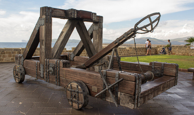 Перед тем, как создать новую игрушечную модель, наши инженеры-создатели изучают всё, что касается её истории и конструкции. Поэтому - наши игрушки самые достоверные, самые историчные - с точностью до мелочей! Итак, сегодня - катапульта! (от греч. katapeltes — «против щита») . Вообще, катапульта — это общее название любой метательной машины. К слову, одноплечевая торсионная метательная машина была изобретена римлянами и названа «онагр». Отметим, что в средневековой Англии катапульту называли «мангонель», а для стрельбы использовали не пращу, как римляне, а ложку. В эту ложку помещали различные снаряды — ядра, камни, сосуды с нефтью, навоз, куски мертвых животных — а потом отпускали её в нужный момент! Освобождённая энергия торсиона стремительно влекла ложку вверх, где она ударялась о горизонтальную преграду и выпускала снаряды с большой силой. Большая катапульта могла послать снаряд весом до 30 кг на расстояние почти до 100 метров! Катапульты использовались средн