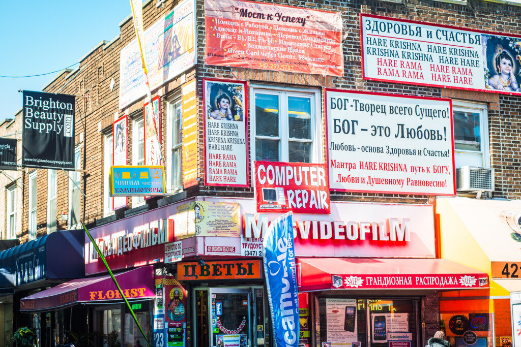 Десятки станций метро разделяют центр Нью-Йорка и Брайтон-Бич. Один час — и ты попадаешь в район, где говорят либо на русском, либо на украинском языках. А еще здесь часто можно услышать симбиоз английского и русского. Самыми популярными словами в обиходе стали «отчарджить», «наслайсить» или, например, «четыре найти найн».