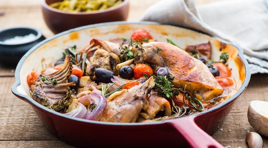 Приготовление 1 час и 10 минут. Рецепт на: 4 персоны. Ингредиенты: кролик 1 ½ тушки помидоры небольшие 6 шт. розмарин 1 шт. оливки 12 шт. чеснок 8 зубчиков мука пшеничная 1 горсть вино сухое белое 350 мл масло оливковое 50 мл перец черный молотый 1 щепотка соль морская 1 щепотка Способ приготовления: Духовку предварительно разогреть до 190°С. Тушку кролика вымыть, обсушить бумажным полотенцем и порезать на кусочки. Муку смешать с солью и перцем и обвалять в ней кусочки кролика. В глубокой сковороде, которую можно ставить в духовку, разогреть оливковое масло и обжаривать кусочки кролика до появления румяной корочки. Чеснок слегка раздавить, не снимая с него шелухи. Помидоры нарезать четвертинками. Из оливок удалить косточки. Влить в сковороду вино, добавить чеснок, помидоры, оливки и 4–5 веточек розмарина, накрыть сковороду крышкой и поставить в разогретую духовку на 25 минут, затем снять крышку и тушить еще 5–7 минут. Готового кролика посыпать оставшимися листьями розмарина. Приятного