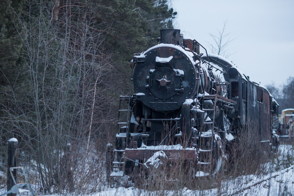 Вдоволь набегавшись по насыпям вдоль октябрьских виадуков, мы поспешили продолжить железнодорожную экскурсию в Суксунском районе — световой день зимой короток, а расстояние нам предстояло преодолеть довольно приличное. От Сарсинского виадука до села Спасо-Барда где находится вожделенное кладбище ржавых монстров — более ста километров. Координаты — N 57º 20.655´; E 57º 21.775´. До Спасо-Барды мы добрались уже в четыре часа вечера — день и так не радовавший нас солнцем уже активно смеркался. Проскочив село насквозь, мы переехали через Сылву и сразу за мостом попали на развилку — можно было спуститься по склону к реке и продолжить путь вдоль нее, а можно было двигаться прямо по узкоколейке. В зимнее время оба пути накатаны и проехать можно на любой машине без проблем. От моста до кладбища ехать совсем немного — буквально 3-4 километра. Сначала нам попалась будка охраны за забором — тревожить бдительных стражников от РЖД мы не решились и по накатанной колее пронеслись мимо. Еще километр по