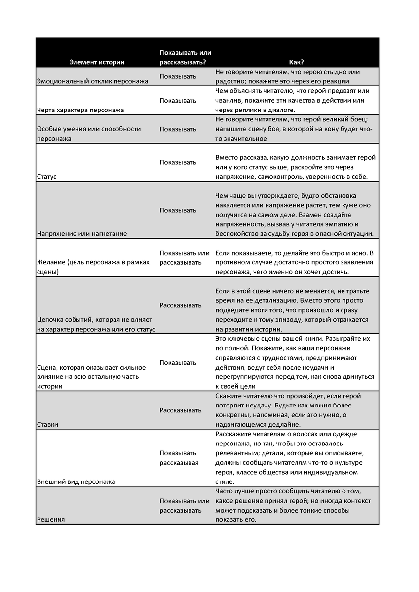 Краеугольный совет едва ли не каждой книги по литмастерству - "Показывайте, а не рассказывайте". Но мы-то прекрасно знаем, что не все так однозначно. Если без конца показывать все до малейшей детали, то книга растянется до размеров ПСС Толстого, а читатель, скорее всего, уснет быстрее, чем доберется до конца первого акта. Не смогла пройти мимо и перевела для вас отличную справочную таблицу из последнего выпуска крупнейшего англоязычного журнала The Writer's Digest. Когда же уместно показывание, а когда - рассказывание?
