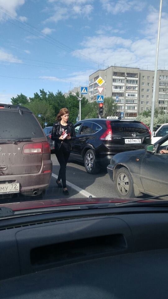 Накануне тюменка выложила в сеть фотографию, на которой видно, как по дороге на ул. Профсоюзная девушка раздает водителям флаера с призывом посетить стриптиз-клуб.