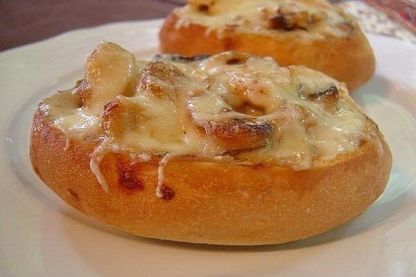 Сейчас расскажу про мою палочку выручалочку на любой праздник или даже обед.Это фаршированные булочки шампиньонами и куриными окорочками(начинку можно любую взять какие у вас есть продукты в холодильнике)я очень люблю такую начинку.поэтому делаю только так.Беру уже готовые булочки столичные(гречневые,кукурузные),какие есть в магазине.Ставлю варить окорочок(1 шт.) в подсолённой воде и специи добавляю,шампиньоны беру в банке в собственном соку резанные (400-500 гр.)можете взять свежие вкус от этого не изменится. Ставлю сковороду вываливаю банку шампиньонов воду вылить,режу лук(1 шт.)и обжариваю до золотистого цвета,вытаскиваю отварной окорочок всё мясо режу мелко и отправляю к шампиньонам, добавляю немного бульона от окорочков(50-100 гр.)кладу банку сметаны(250 гр.)перемешиваю и тушу 4-5 минут.Даю остыть начинки и в это время занимаюсь с булочками,разрезаю их на пополам вынимаю мякоть из середины булки и туда кладу начинку,потом на крупной тёрке натираю сыр тв.(150 гр.)смешиваю его с