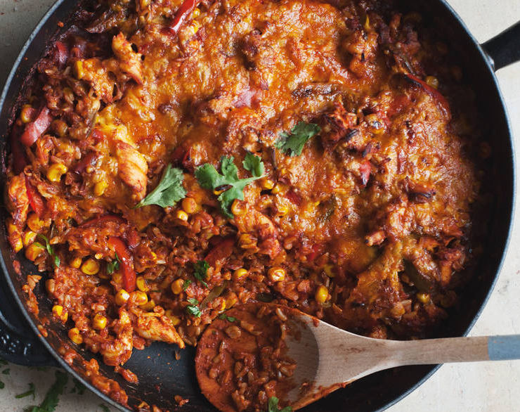 Ингредиенты: Порций:- 6 + 400 г куриная грудка 4 зеленый лук 3 гвоздики чеснока 1 красный перец 1 зеленый перец 20 г кинза 2 ст. растительное масло 275 г кукуруза (консервированная или замороженная) 475 мл куриный бульон 680 г соус енчилада 260 г рис (белый или коричневый) 260 г сыр чеддер (тертый) поваренная соль; перец Приготовить: большая сковорода с крышкой;духовой шкаф;разделочная доска;нож ; Шаг 1: 400 г куриной грудки нарезать на большие кусочки. Раздавит 3 зубчика чеснока и 20 г кинзы, нарезать перец на полоски и мелко нарезать луковицы. Шаг 2: Нагрейте 1ст.л растительное масло в большой сковороде на высокой температуре. Добавьте кусочки курицы в сковороду и обжарьте 5-7мин. до золотистой корочки. Затем отложите ее. Шаг 3: Нагреть другую половину растительного масла и добавить лук и чеснок. Добавить обжаренные кусочки курицы. Подержать 1-2мин чтобы придать аромата. Затем добавьте болгарский перец. Продалжайте мешать и добавьте кукурузу, 475 мл. куриный бульон и соус енчи