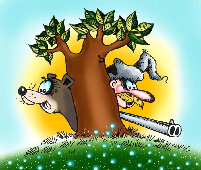 *** Идут по лесу два кореша. Один спрашивает: Ты видал? Нет. Да ты что? Только что утка пролетела. Идут дальше. Опять спрашивает: Ты видал? Нет. Да ты что слепой? Кабан только что в кусты убежал! Через некоторое снова спрашивает: Ты видал? Второй красный от злости твёрда ответить: Даа видел! Так что ты тогда в говно наступил? *** Собрался Мужик с корешами на охоту, а супруга ему: — Серёж, а Серёж! Возьми с собой хоть раз на охоту! Уже три года божился, что возьмёшь! — Ну раз так, то собирайся! — "Все равно не отстанешь". Приехали они в лес. Дает супруге ствол и говорит: — Ты тут затихорись, а я с корешами пошел кабана загонять! Как только кабан появится, ты его вали! А еще смотри, чтобы кабана другие охотники не спёрли! Проинструктировал супругу, а сам ушел с корешами водку пить. Час бухают, третий, четвёртый, вдруг слышат стрельба. Прибегают, и видят: Сидит жена Серёги на добыче, направив ствол на какого то старика и орет: — Вали отсюда! Это мой кабан! Это я его завалила! А тот дро