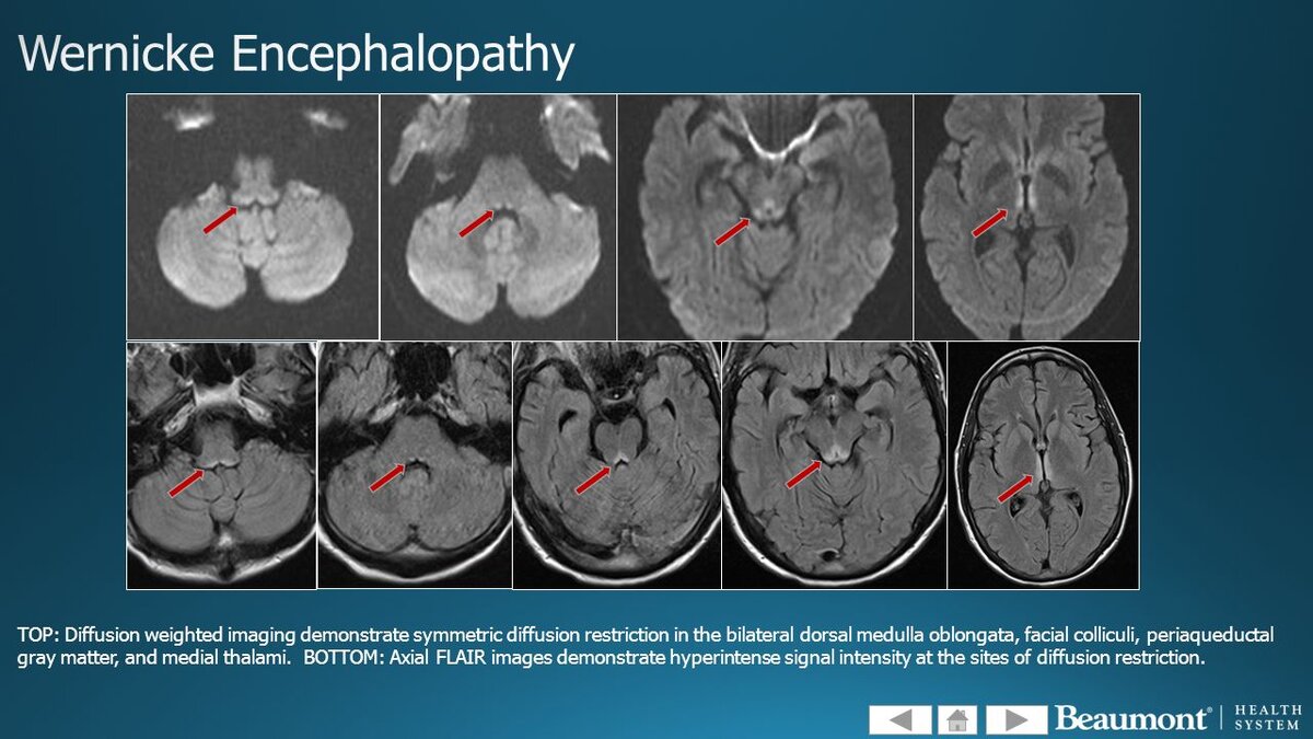 Энцефалопатия Вернике связана с дефицитом тиамина (витамин В1) и классически характеризуется триадой: острая спутанность сознания, атаксия и офтальмоплегия. Однако амнезия может быть основным или единственным когнитивным нарушением, особенно после начала лечения тиамином, когда улучшаются другие психические функции. Потому что у пациентов с энцефалопатией Вернике выявляется глобальное расстройство сознания, а не изолированная амнезия. Источник: Clinical neurology 9th Edition.
