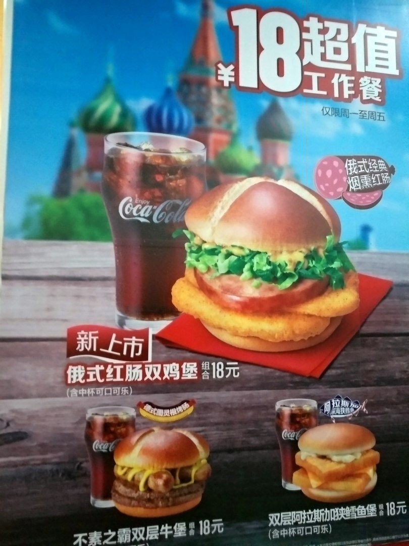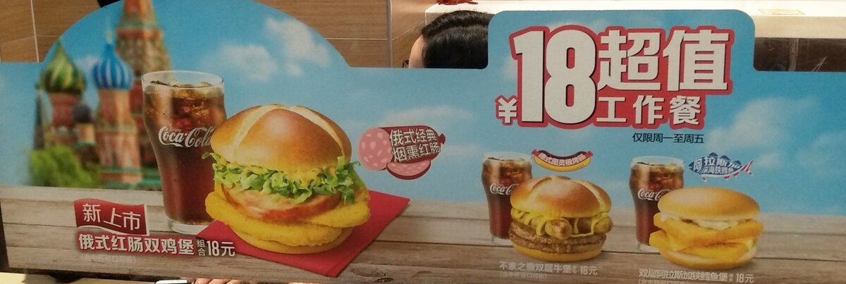 За 18 юаней (около 180 руб.) здесь можно попробовать бургер по-русски с традиционным русским вкусом и запить его стаканчиком колы.