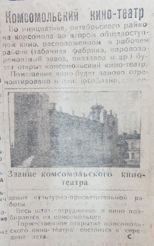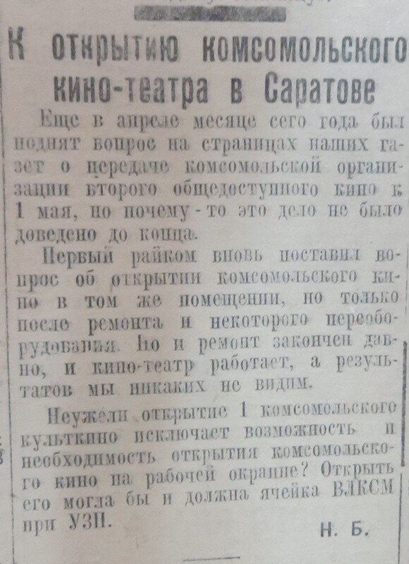 В 1935 году в Саратове предлагали открыть Комсомольский кинотеатр. В действующем кинотеатре ("второе общедоступное кино"), который располагался на пересечении Рабочей и Университетской. Известно оно было до сноса здания в 1980-х, как кинотеатр "Рабочий". Потом 1-й Комсомольский кинотеатр всё-таки открыли в помещении консерватории ("Юнгштурм").