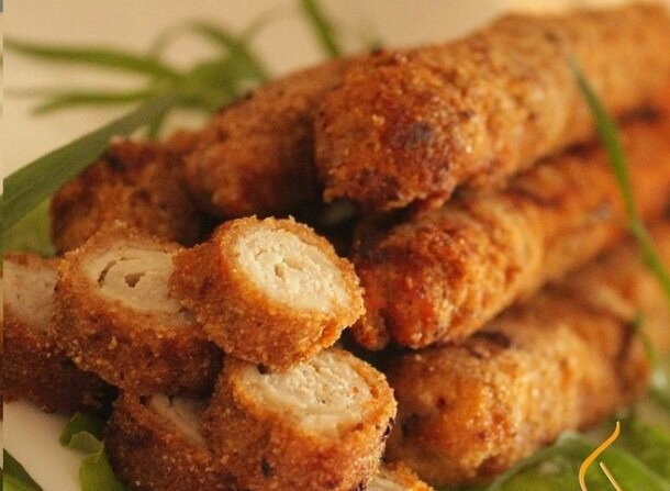 Рецепт мясных палочек с начинкой из сливочного масла, которые подают в качестве основного блюда или закуски. Готовить его можно из свинины или более легкого мяса курицы (филе). Сливочное масло, которое кладется внутрь, тает при жарке и когда палочку разрезают или кусают, оно вытекает наружу. А еще, придает блюду сочность. На готовку уходит до 15-20 минут. Из инвентаря понадобится сковородка и молоток для отбивания мяса. Если у вас его нет, можно обойтись обратное (не острой) стороной ножа. Понадобятся следующие продукты: Мясо порежьте тонкими пластами, как на отбивные, даже немного тоньше. Без фанатизма отбейте его молотком, чтобы не появились разрывы. На край положите кусочек масла или твердого сыра и сверните в трубочку. Обмокните каждую палочку по несколько раз то во взбитом яйце, то в хлебной крошке (панировке). Обжарьте на раскаленном масле. Всего вам вкусного!