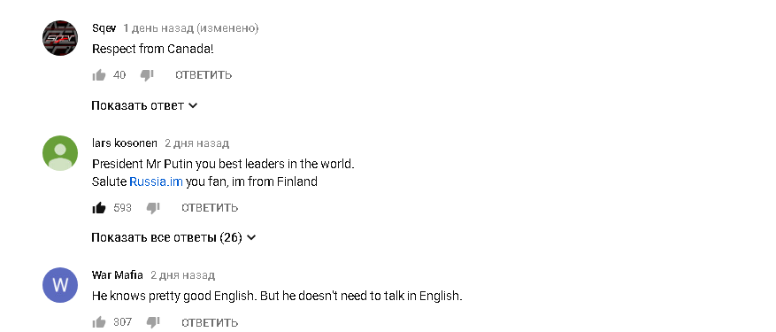 14 июня в России стартует Чемпионат мира по футболу FIFA. По этому случаю президент Владимир Путин записал видеообращение к поклонникам футбола и сборным. Глава государства тепло поприветствовал гостей мундиаля. «Для нашей страны большая радость и честь принимать представителей огромной футбольной семьи. Подарить вам настоящий праздник, наполненный спортивным азартом и острыми эмоциями, — отметил Владимир Путин. — Надеюсь, незабываемые впечатления у вас оставят не только матчи любимых команд и мастерство игроков, но и знакомство с Россией, ее самобытной культурой, уникальной историей и богатейшей природой. С ее радушным, очень искренним и дружелюбным народом». Свое выступление Владимир Путин завершил на чистом английском, сказав «Welcome to Russia!», что, как ни странно впечатлило многих иностранцев считавших, что русский президент разговаривает только на русском и на чистейшем немецком с баварским акцентом. За первые два дня на одном из каналов, специализирующихся на "русской тем