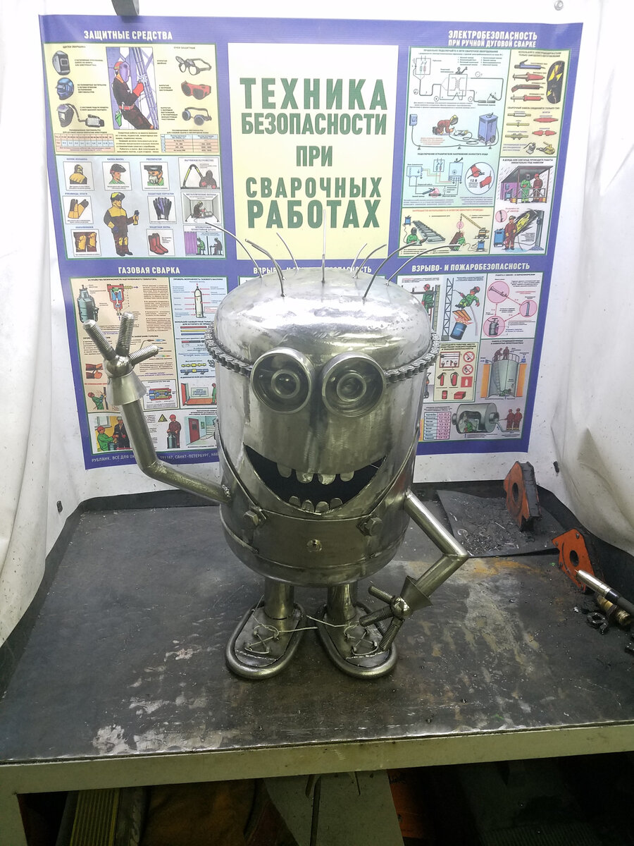 Всем рукастым привет. Столько выходных, продолжаем проводить их с пользой в гараже. Еще зимой позвали на "Ярмарку мастеров" 12 июня, дают стол 70х70 и палатку. Но еще точно не знал посещу ли я ее.Просто свои железки не охота было нести. Хотел сделать миньона из баллона, но времени не хватало. За два дня до выставки все таки решился. Вот, что получилось за полтора дня работы.