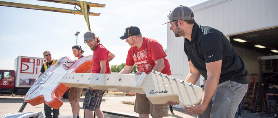 Крис Рибшлэджер из Dimensional Innovations представил на двухдневном музыкальном фестивале в Канзас-Сити самую большую электрогитару в мире. Boulevardia Guitar - это огромная музыкальная установка, выполненная в виде электрогитары. Вес “инструмента” - 230 килограмм, высота - 3,5 метра. Корпус гитары изготовлен из фанеры, металла и пластика. Внутри инструмента размещена электроника, а на грифе - контактные пластины, которые замыкаются с проводящими ток струнами. Когда человек зажимает струну на Boulevardia Guitar, контакт между струной и грифом замыкается, в результате чего образовывается сигнал, который передается к программе на миникомпьютере Raspberry Pi. Последний, в свою очередь, проигрывает соответствующий звуковой файл, импортированный из GarageBand. Полноценно сыграть на 3,5-метровой гитаре под силу разве что семиметровому великану. Но побрынчать у подножия гигантского инструмента может каждый. Как создавалась Boulevardia Guitar, можете посмотреть здесь.