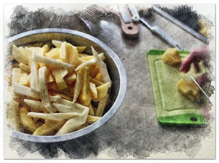 Долгие часы вымачивания овощей, особенно картофеля, лишает их необходимых витаминов, минералов и белков, растворенных в овощном соке. После чистки и полоскания овощи должны быть немедленно нарзанные и залиты горячей водой и поставлены вариться на плиту. Овощи обычно нарезают на кубики, например, картофель для супа. Корнеплоды нарезают — в зависимости от толщины корня — в кольца, полу- или четверть-диски. Таким образом, обычно готовят морковь и петрушку с цилиндрическим корнем.