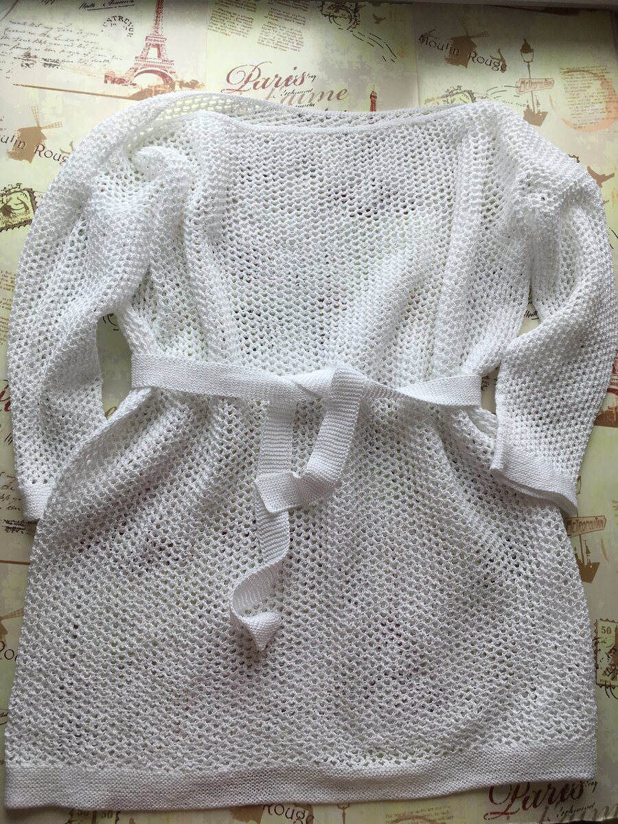 Недавно у меня связалась вот такая туника-сетка из тоненького хлопка. Она очень свободная, "балахонистая". Рукав 3/4 со спадающим плечом. Талия подчеркнута пояском.
