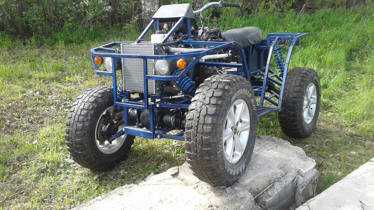 Мотовездеход с колесной формулой 4х4 собран из узлов и агрегатов от Отечественных автомобилей. Мощный, надежный и бюджетный квадрацикл собранный в гараже намного лучше заводских моделей, что в очередной раз доказывает люди у нас очень умные и способные создавать технику повышенной проходимости покруче чем заграницей;) Квадрацикл Виталий собрал у себя в гараже и для сборки использовал запчасти от автомобиля ОКА Отечественного производства, заимствован двигатель, КПП, электрика и электроника. Мосты задний и передний укороченные от ВАЗ 2106. Подвеска независимая двухрычажная А-образные рычаги подвески -это самый надежный и распространенный вид. Рама сварена из проф трубы, каркас так же сделан из профиля. На постройку мотовездехода у автора ушло порядка 60 К рублей, конечная цена вопроса около 100 К руб) Это очень неплохо неправда ли ? По качеству и надежности он лучше любого Китайца, а цена в три, четыре раза меньше. Квадрацикл еще находится на стадии сборки, осталось сделать пластиковую