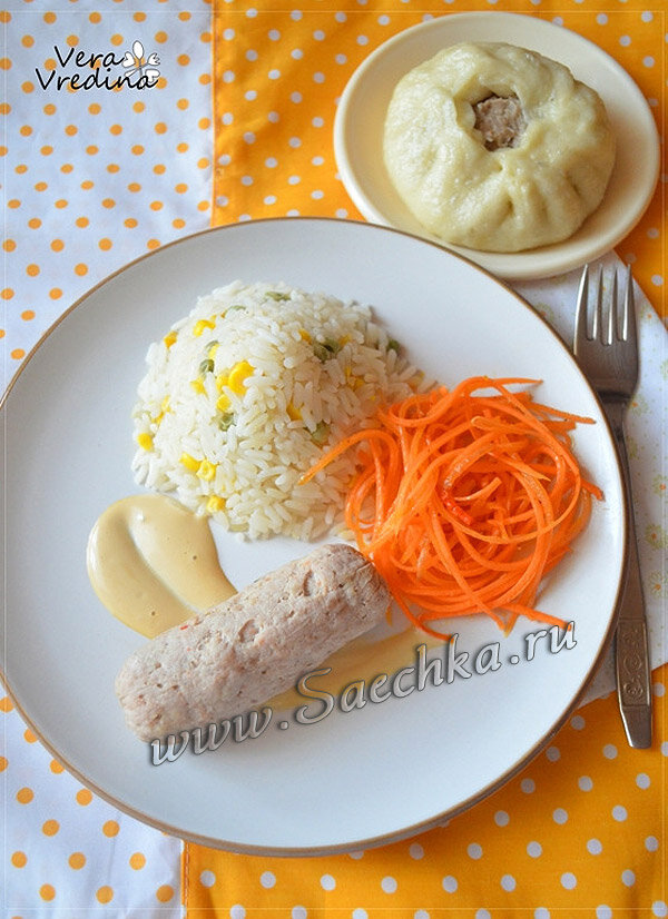 Домашние куриные сосиски приготовлены в пищевой плёнке, подавала с рисом, морковью по-корейски и пянсе.