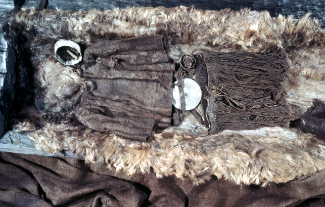 Когда исследователи открыли гроб, то обнаружили там останки молодой женщины 16 - 18 лет, ростом около 160 сантиметров, светловолосой, с хорошо обработанными, чистыми ногтями, что натолкнуло ученых на мысль о ее принадлежности к знати. Она была одета в шерстяные корсаж и короткую юбку, на ее поясе крепился крупный металлический диск. У ног девушки покоился прах ребенка 5 - 6 лет. Также, в последнем путешествии ее сопровождали набор необходимых в быту инструментов и ведро пива. Высокий уровень сохранности артефактов