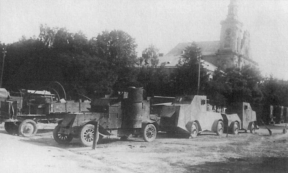На переднем плане два бронеавтомобиля "Джеффери-Поплавко", бронеавтомобиль "Остин" и грузовик "Гарфорд". Интересно, что данные бронеавтомобили использовались фрайкором против спартаковцев в Берлине в 1919 году. "Джеффери-Поплавко" в фрайкоре мне на фото пока не попадались, а вот "Остин"-ы встречаются на фото довольно часто