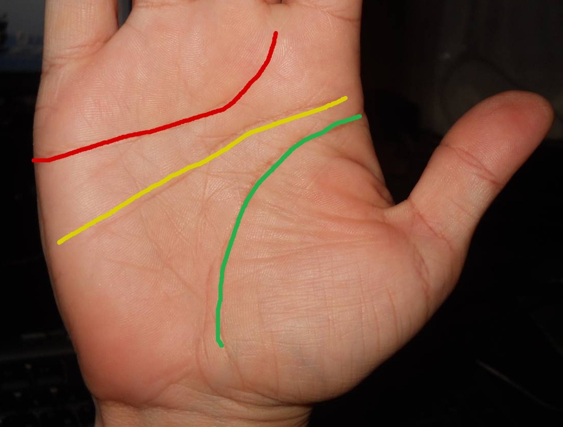 Ни для кого не секрет, что линии на руке могут многое рассказать о судьбе и жизни каждого человека. Этими вопросами занимается хиромантия, она достаточно простая и познать ее под силу каждому. На какой руке смотреть эти линии? Профессионал своего дела скажет сразу - на обоих. Как известно, на левой руке находятся изначально данные показатели - то, что дано от рождения. На правой же руке показана текущая ситуация и будущее человека. В течении жизни линии могут изменяться, под влиянием тех или иных событий. Если взглянуть на ладонь, можно заметить не один десяток различных по форме и направлению линий. На первый взгляд кажется весьма сложным, но основной костяк - это всего три линии: - линия сердца (красная) - линия ума (желтая) - линия жизни (зеленая) Линия жизни ничего не скажет о ее продолжительности, но если она хорошо прочерчена, достачно длинная и не разветвляется, это означает хорошую жизненную энергию и здоровье, а отходящие от нее линии под углом вниз обычно указывают на различ