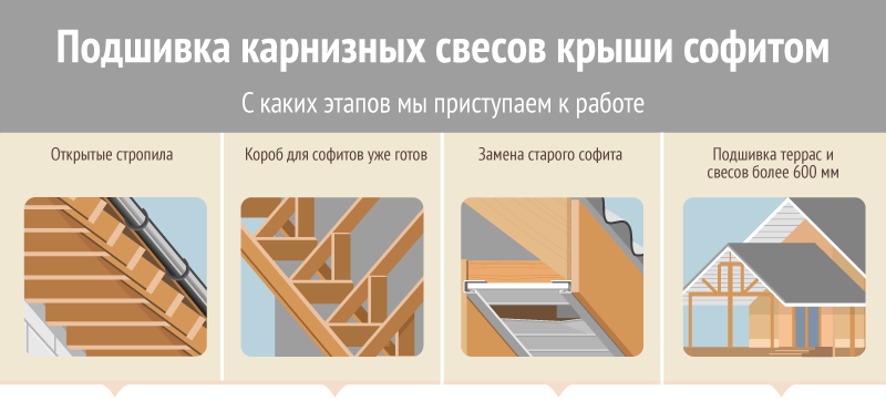 С каких этапов мы приступаем к работе Софиты служат отличным декоративным и защитным элементом карниза крыши. Они могут быть установлены на кровельные системы различной степени готовности – на открытие стропила, при наличии короба для софитов. Так же мы выполняем замену устаревшего софита и подшивку террас и свесов более 600 мм. Объем заказа и степень готовности кровли непосредственно влияет на стоимость работ подшивки свесов крыши софитом. Сколько будет стоить монтаж подшивки крыши Расценки на подшив карнизов разнятся в зависимости от материала изготовления. Цены также зависят от того будет ли осуществлена установка в процессе монтажа или на готовую кровлю. Мы выполняем монтаж софитов из меди, алюминия, металла, пластика. Наша компания предлагает разные варианты, подшивка карнизов крыши производится опытными мастерами. Работы подшивки кровли являются одним из основных направлений деятельности компании «Кровля под ключ». Конечную сумму вы узнаете после обращения к нашему специалисту-з