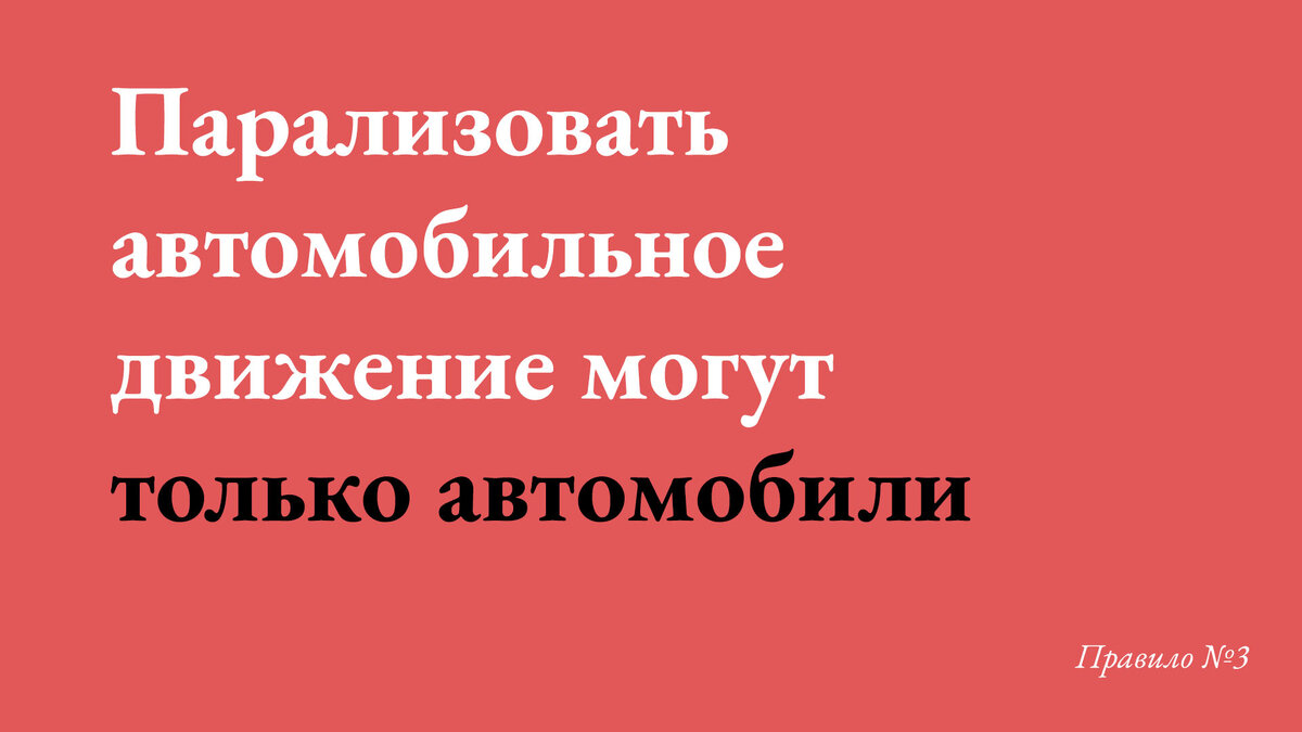 Что-то у меня сегодня такое настроение, что хочется напомнить: парализовать автомобильное движение могут только автомобили. Нельзя парализовать автомобильное движение убрав парковку (придумают же, а), сделав выделенные полосы для общественного транспорта или организовав велодорожку. Если вы сделали что-то такое и проехать по улице стало сложнее — это не значит, что у вас слишком узкая улица. Это значит, что на вашу улицу заехало слишком много автомобилей. Кстати, если вы ничего такого не делали и проехать по улице всё равно сложно — это снова не значит, что она слишком узкая. Просто на неё, представьте себе, заехало слишком много автомобилей. Вот вам карточка на всякий случай.