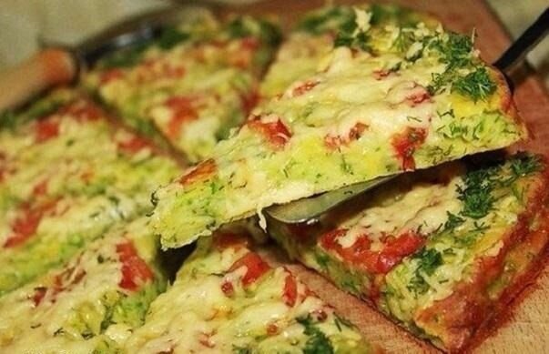 Новинка из кабачков — обалденная домашняя пицца! Она очень нежная, легкая, диетическая, и готовится в два счета! А еще, в отличие от классической пиццы, кабачковая вкусная как в теплом, так и в холодном виде. Даже на завтра она останется сочной и нежной, и не будет чувства, что ты грызешь сухарь! Поэтому берите кабачок в руки, и давайте приготовим обалденную пиццу и вкусно удивим всех своих дома! Ингредиенты: Приготовление Молодой кабачок натираем на мелкую терку, откидываем на сито и отдавливаем руками или ложкой, чтобы стекла лишняя жидкость. Далее кабачок перекладываем в миску и добавляем к нему сырое яйцо, солим (приблизительно 0,5 чайной ложки), приправляем молотым перцем. Мелко крошим зелень укропа, петрушки, перья лука и добавляем их к кабачкам. Муку просеиваем и небольшими частями добавляем к кабачкам и хорошо вымешиваем. В зависимости от того, насколько был отжат кабачок и какая мука, ее может понадобиться немного больше или меньше. В общем, тесто на пиццу должно получиться н