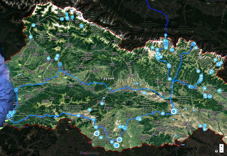 Но сначала коротенечко про маршрут, который я себе накидал. Как говорил Руаль Амудсен, "Экспедиция — это подготовка", поэтому собираясь в Грузию во второй раз, я нанес на карту маршрута всё, что хоть как-то меня интересовало, казалось полезным и вообще могло хоть как-то пригодиться. В первый раз я ездил без теоретической подготовки в рамках тест-драйва и многое, как мне кажется, упустил. В этот раз я посвятил проработке маршрута много часов и эта тактика, как мне показалось, отлично себя зарекомендовала. Во всяком случае, у меня всегда был запасной вариант куда поехать и что посмотреть, если первый по какой-либо причине обламывался.