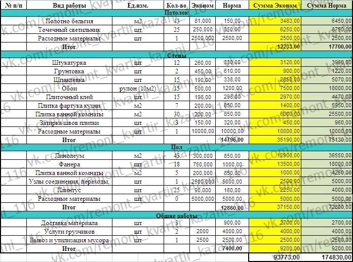 Ниже я прикрепляю смету на материал для капитального ремонта двухкомнатной хрущевки на Академика Королёва. Я подготовил её по просьбе заказчика, который хотел более точно оценить расходы на ремонт. В смете отсутствуют двери, так как заказчики еще не определились, что у них будет, двери или арки.