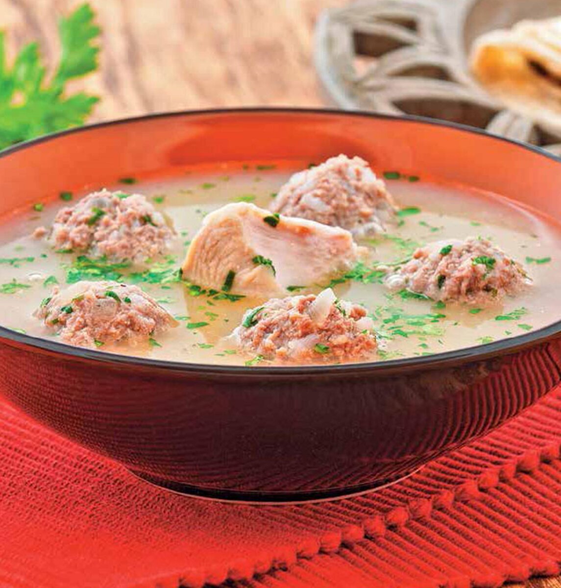 Время приготовления: 1,5 часа Ингредиенты: половина тушки курицы (около 600 г) 2 луковицы 1 морковь 2 ст. л. топлёного масла 2 ст. л. риса 1 пучок кинзы 300 г бараньего или говяжьего фарша 2 яичных желтка 2 ст. л. лимонного сока соль и перец по вкусу Приготовление: 1. Курицу разрубить на крупные куски. Одну луковицу и морковь очистить, крупно нарезать. Сварить бульон из курицы с добавлением овощей и 1 литра воды в течение 45 минут. Достать курицу, бульон процедить, овощи из бульона выбросить. 2. Вторую луковицу очистить, мелко нарубить и спассеровать на топлёном масле до мягкости, около 5 минут. Рис промыть и отварить до полуготовности около 8 минут, откинуть в дуршлаг. Кинзу помыть, обсушить, мелко нарубить. 3. Добавить к фаршу рис, пассерованный лук, кинзу, соль и перец по вкусу. Тщательно вымешать. Скатать из фарша шарики размером с грецкий орех. 4. Куриный бульон довести до кипения, положить в него шарики из фарша и варить 10 минут. 5. В отдельной миске растереть яичные желтки с ли