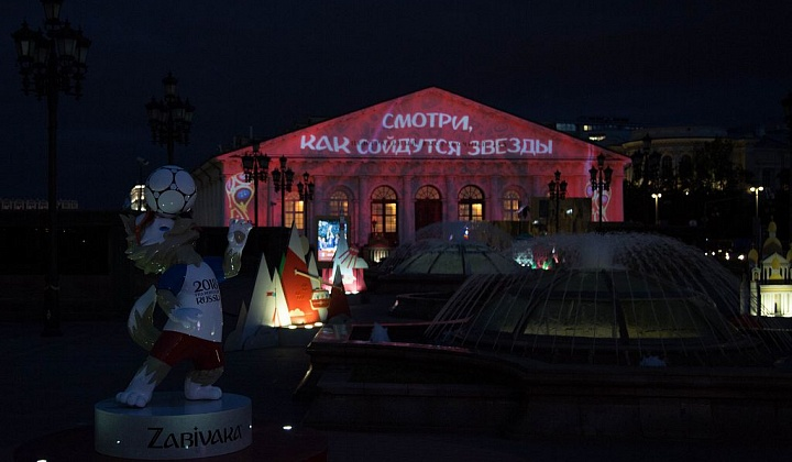 Световое шоу, посвященное ЧМ-2018, на фасаде здания «Манеж»