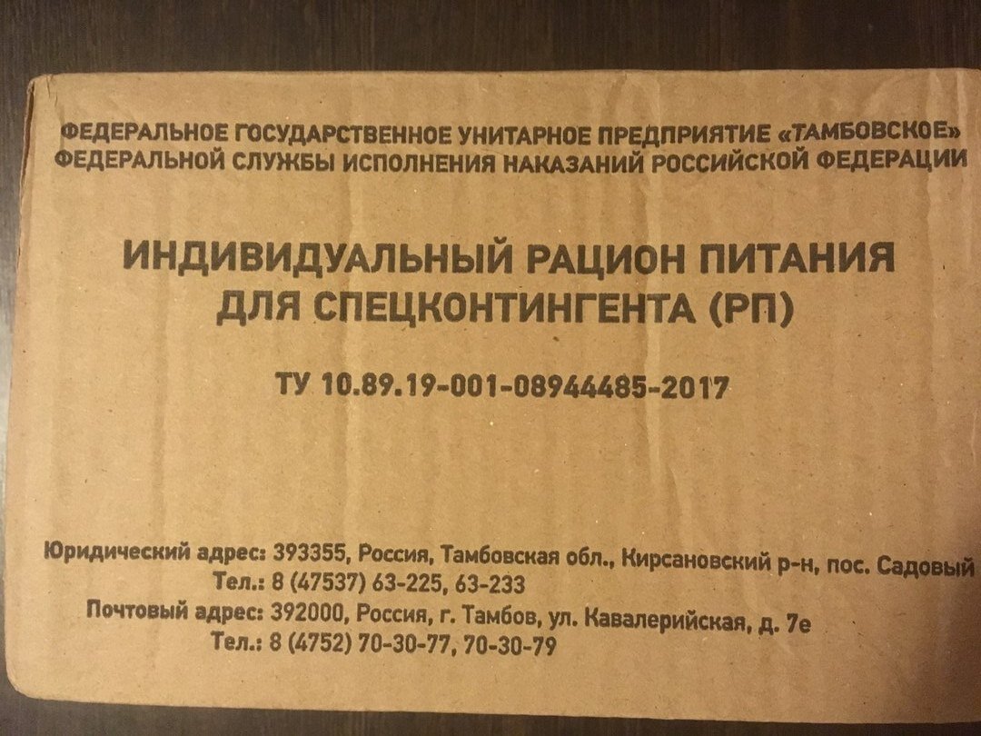 Данный рацион предназначен для питания заключенных. Срок годности 1,5 года. Странно, так как все продукты, входящие в данный ИРП имеют срок годности не менее 2-х лет. Энергетическая ценность 2400 кКал Вес 1 кг Фото отсюда https://zen.yandex.ru/media/zhena_ohotnika/suhpai-zakliuchennogo-chto-vhodit-i-kak-na-vkus-5b046b97d7bf2195a208b69f Напоминаю, что мы переносим нашу базу по истории российских сухпайков из ЖЖ ( http://pa-ek.com ) на яндекс-канал "Сухпаек.рф", т.е. сюда. Подписывайтесь на канал "Сухпаек.рф" на Яндексе http://сухпаек.рф Здесь собрана информация, какие бывают сухпайки: