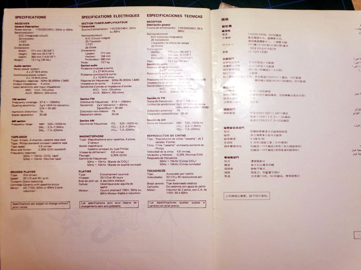 Достался , от хороших друзей, вот такой японский артефакт. Sharp SG-320X. Измученный жизнью, покрытый пылью как снаружи так и изнутри, от долго бездействия и таскания по гаражам. Один живой канал,и работающий тюнер FM. Все остальное мертвое ( вертушка , кассетник ). Но возникло стойкое желание вдохнуть в аппарат вторую жизнь. Повезло еще вот с чем. С аппаратом сохранился заводской "юзер мануал", и что сильно облегчило жизнь в восстановлении, была приложена принципиальная схема. То есть по электрической части и схемотехнике "гадание на кофейной гуще" не предполагалось. Технические данные самого аппарата, были тоже весьма не плохими, даже по современным меркам.