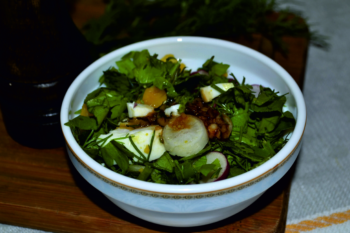 На календаре первый день лета. А у нас в Сибири еще даже черемуха не зацвела, зато в теплице зелень уже радует вовсю: руккола, кресс салат, кинза, редиска, укропчик. Поэтому нужно как можно больше делать салатов из этой первой зелени, по которой так соскучился организм за долгую зиму. Заправка для такого салата может быть любая: от сметаны или майонеза (с майонезом, конечно, будет вкусно, но он просто перебьет вкус зелени) до масла. Ингредиенты для салата яйца - 3 шт., укроп - пучок листья рукколы - пучок листья шпината - пучок кресс-салат - пучок кинза - пучок зеленый лук - пучок редиска - пучок соевый соус - 3-4 ст. л., растительное масло - 3-4 ст. л., чеснок - 3-4 зубчика Для салата использую всю зелень, которая уже выросла: рукколу, листья шпината, укроп, кресс-салат, перья зеленого лука, кинзу и редиску. Всю зелень и редиску тщательно промываю, меняю воду несколько раз. Редиску нарезаю кружочками. Складываю редиску в салатник. Листья шпината и рукколы нарезаю крупно. Можно пр