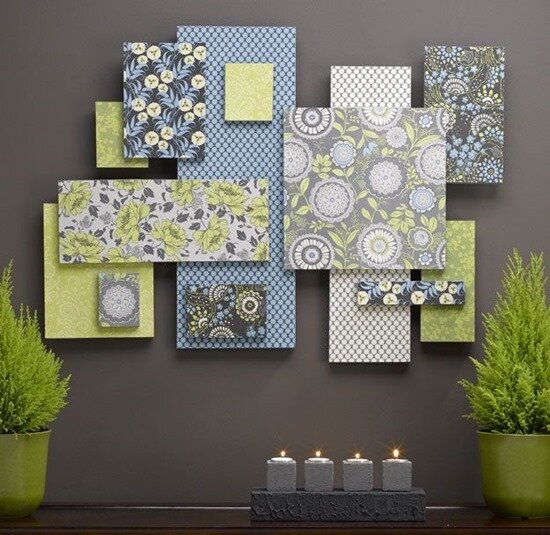 Такие панно можно разместить на стене в определенном порядке, в зависимости от стиля интерьера и площади стены. Декоративную бумагу можно найти в строительных супермаркетах и магазинах, продающих материалы для ручной работы.