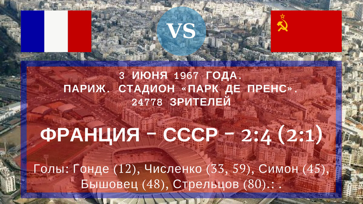 От поражения французов не смогли спасти даже родные стены. Сегодня, я хочу поблагодарить всех игроков сборной России образца 2018 года за игру, которую она стабильно демонстрирует в своих последних играх. Во многом, благодаря нашим удивительным футболистам, я нашел возможность еще раз вспомнить о славных страницах футбола "made in USSR". Спасибо, парни! И глупая мысль, - "А может... удивят наши?" Удивят, не сомневайтесь. Пятьдесят один год назад. 3 июня 1967 года в Париже, на стадионе "Парк де Пренс" футбольная сборная СССР, в очередной раз продемонстрировала высокий класс советского футбола. На этот раз, добившись волевой победы в товарищеском матче с хозяевами поля, французами со счетом 4-2. Забегая вперед, хочу сказать, что в этой игре пересеклись одновременно немало противоположностей. Французская команда сильно отличалась по стилю игры, физическим качествам игроков, заряженностью на борьбу до последних минут игры от советской сборной. Даже первый и второй таймы были непохожи