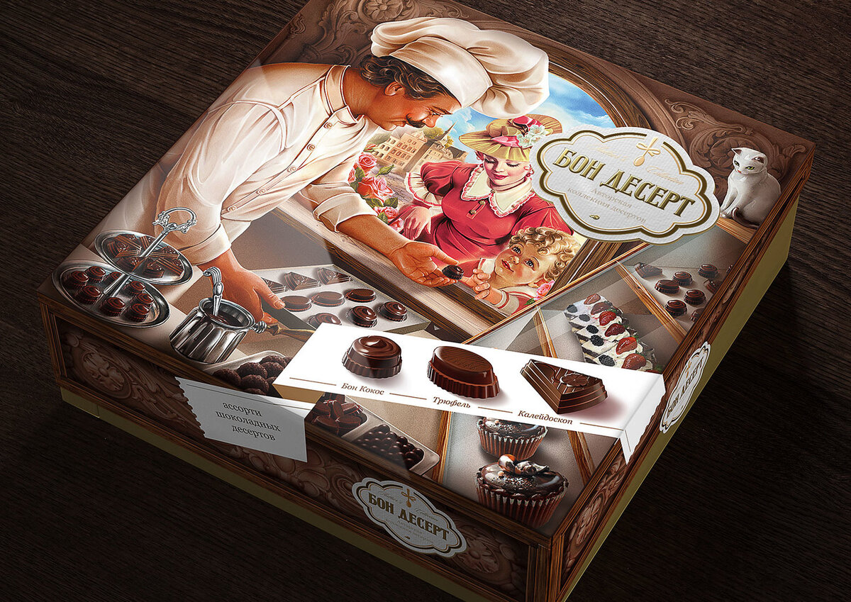 Бон Десерт в дизайне от BQB Branding Bon Dessert — это ассорти шоколадных конфет-десертов ручной работы. В набор входят девять авторских конфет-десертов из молочного и темного шоколада с кокосовой, трюфельной и сливочной начинками, декором из розовой кондитерской крошки, сахарной мимозы, позолоченных какао-бобов, с апельсиновыми цукатами и кусочками клюквы. Агентство BQB, изучив рынок шоколадных десертов и особенности данной категории, предложило заказчику концепцию дизайна упаковки, построенную на высококачественной иллюстрации, выполненной в ретро-стилистике. Такой имидж и детальность прорисовки хорошо подчеркивают качество самого продукта, в основе которого ручная работа и индивидуальный подход на всех этапах производства. Также важным этапом проекта была разработка формы и дизайна коробки. После рассмотрения нескольких концепций форм и конструкций остановились на оригинальном решении — коробке с диагонально «скошенной» крышкой и трёхуровневом «пьедестальном» корексе. брендинговое а