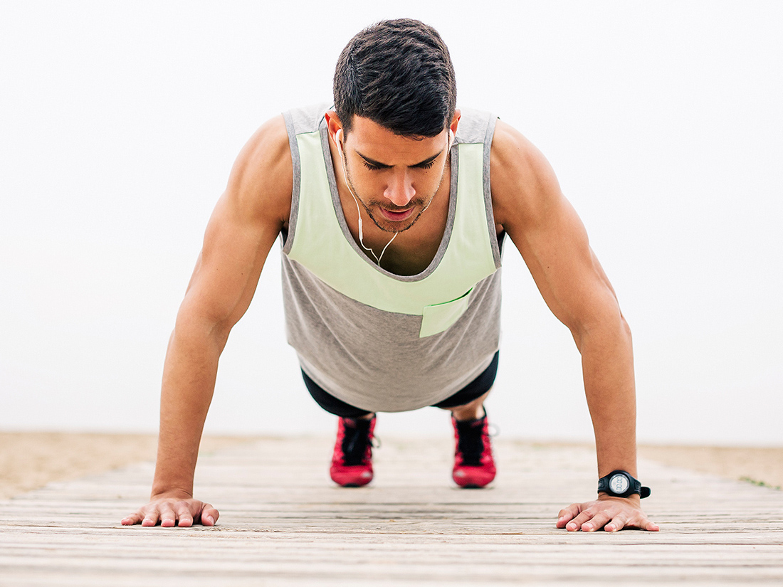 Задерживать дыхание во время отжиманий нельзя, так как может ухудшиться самочувствие и повыситься давление. Расстояние между руками Руки нужно поставить на ширину плеч. Локти и запястья должны быть на одной линии. Такая позиция не будет перегружать суставы. Положение локтей Во время отжимания локти должны быть поближе к телу. Таким способом увеличивается нагрузка на трицепсы. Если сгибать локти вбок, усиливается нагрузка на плечи и грудные мышцы. Положение бедер Бедра должны быть на одной линии с плечами. Тогда ты будешь сконцентрирован на выполнении упражнения, а не на стабилизации позиц