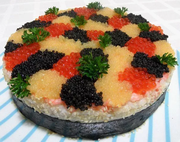 Невероятно необычный торт для вашего стола. Выглядит очень шикарно и дорого! Ингредиенты: 1. Рис (для суши) – 1 стакан 2. Вода (отстоянная) – 2 стакана 3. Уксус (рисовый) – 2 ложки столовые 4. Сахар (песок) – 1 ложка чайная 5. Соль (поваренная, пищевая) – по вкусу 6. Яйцо (диетическое) – 3 штуки 7. Креветки (очищенные) – 200 грамм 8. Семга (свежая, слабосоленая) – 150 грамм 9. Авокадо (спелое) – 1 штука 10. Майонез – 5 ложек столовых 11. Масло (растительное, рафинированное) – 3 ложки столовые 12. Нори (для суши) – 4 листа 13. Кунжут – 1 ложка чайная 14. Соус (соевый) – по вкусу 15. Листья петрушки (для украшения) – по вкусу 16. Икра красная – 70 грамм 17. Икра черная белковая – 70 грамм 18. Икра минтая – 70 грамм. Итак, рис для суши отварим в кипящей подсоленной воде до полной готовности, сольем воду, слегка промоем отваренный рис. В стакане размешаем рисовый уксус, сахар и соль. Вольем полученную смесь в рис. Тщательно перемешаем с помощью деревянной лопатки, предназначенной для при