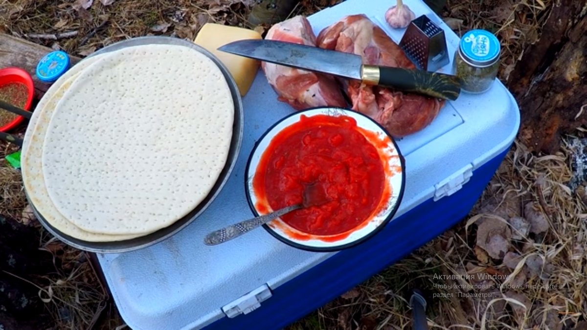 Рецепт простой,нам нужно,готовые коржи,томатная основа,можно томатный соус сыр,мясо,приправа,чеснок да лук.Мясо разделываем и нарезаем кубиками как для жарки шашлыка,потом обжариваем нарезанное кубиками мясо Готовое мясо нарезается тонкими ломтиками и укладываются в тарелку.Потом равномерно наносим на корж томатную основу,и сверху укладываем на резанное ломтиками мясо равномерно по коржу.Сверху натираем на тёрки сыр,лук и чеснок укладывается по вкусу.Заготовка укладывается на сковороду или на в казан на специальный подогнанный по диаметру круг,это дает жару равномерно распределятся по казану и дает эффект духового шкафа.Казан отправляется на 10-12 минут на костёр,главное не пересушить корж.