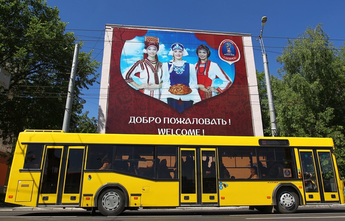 Баннер, установленный на одной из улиц Саранска к предстоящему чемпионату мира по футболу-2018. Его можно будет встретить во всех городах, где пройдут матчи турнира: в Москве, Санкт-Петербурге, Казани, Нижнем Новгороде, Ростове-на-Дону, Самаре, Сочи, Волгограде, Екатеринбурге, Калининграде и Саранске.