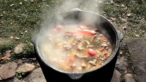 Нам нужно:Картофель,говяжья грудина,мясо свинины,томаты,чеснок,сельдерей,лук,морковь,кинза,сельдерей,красный болгарский перец. И специи: жгучий перец,кориандр,базилик,тимьян,черный перец, В первую очередь варим бульон из говяжий грудины.Большой котелок кладём мясо с водой и ставим на костер,котелок должен стоять под наклоном,так бульон получается наваристым и накрываем его крышкой.Пока варим говядину,нарезаем корень сельдерея ломтиками он хорошо сочетается с мясными блюдами придает пряный вкус.Чистим морковку и нарезаем её ломтиками ,потом чистим картофель,но оставляем его крупным ,нарезаем лук.Берем свининое мясо и нанизываем на шампур это мясо готовим на углях оно не станет отдельным блюдом.Достаем из котелка полностью проваренное мясо,и засыпаем в этот же бульон котелке,сельдерей и морковь.Котелок ставим так же ставим на костер и ждем пока закипит. Нарезаем на куски отваренное мясо, и заранее мелко нарезаем чеснок и свежую кинзу её еще называют китайская кинза,и хорошо перемеш