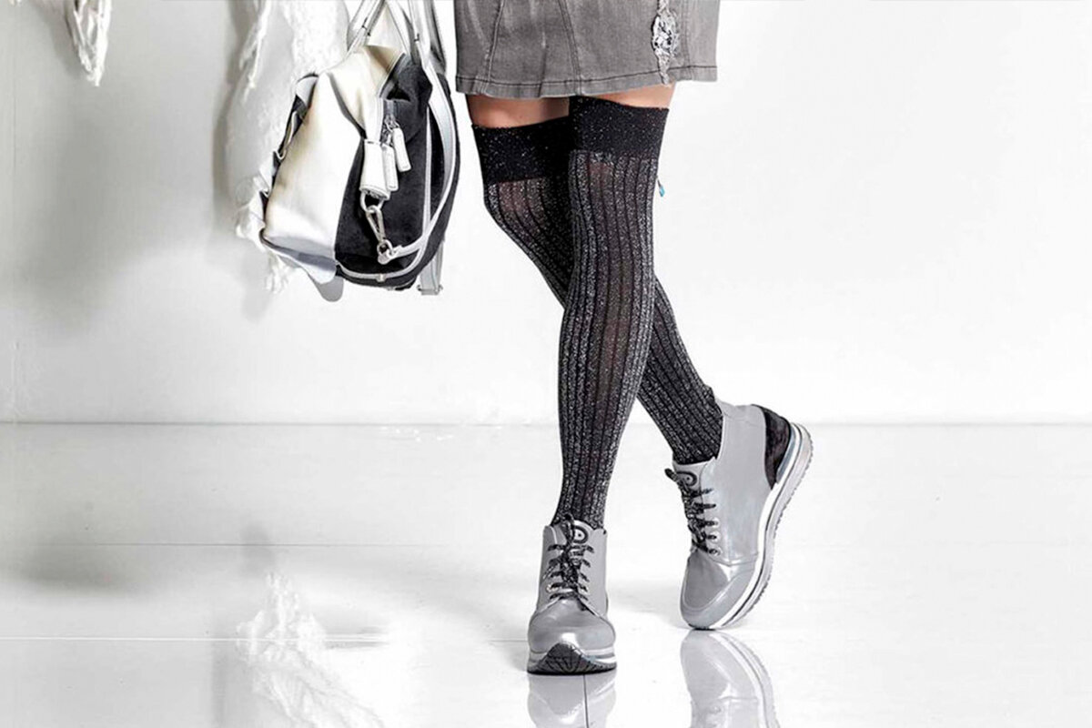 Они хорошо сочетаются с любой обувью, в том числе и со спортивной. Оригинальная вязаная модель длиной выше коленей будет уместна в комплекте с парой на низком каблуке, плоской подошве или массивной платформе. Их также можно комплектовать приталенным платьем либо джинсовыми шортами и футболкой поло. Гольфины позволяют миниатюрным девушкам зрительно удлинить ноги. Лучше все с такой задачей справится аксессуар, выдержанный одном цвете с обувью. Сюда имеет смысл добавить антрацитовые шорты с высокой талией и оригинальной шнуровкой.