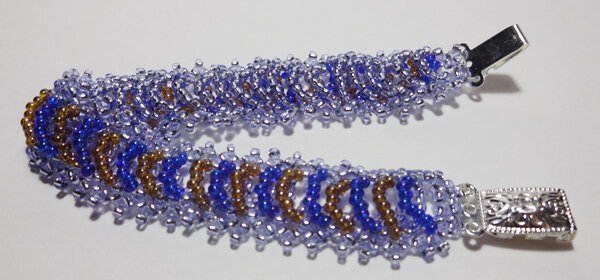 Сегодня я опишу как плести цепочку "змейка" и как сделать на её основе простой но красивый браслет. Цепочка "змейка" весьма коварна: она любит путаться и крутиться (чем больше бусины, тем меньше будет путаться). Поэтому, на мой взгляд, для фенечек она не подходит, зато ее можно использовать в браслетах и колье. Для плетения браслета, описанного ниже, рекомендую оставить на концах цепочки побольше нитки, чтобы можно было доплести длину браслета, если был сделан неправильный расчет длины (плюс замочек пришивать будем этой же ниткой). Итак, набираем на иголку 3 бисерины и проходим через 2 последних, получается "зубец" Затем набираем 2 бисерины и проходим через одну уже проплетённую и первую набранную бисерины. Продолжаем плести нужную длину для браслета. Мне удобно"змейку" плести "на весу" на руке. Длина "змейки" должна быть на 2 обхвата руки, потому что мы будем складывать цепочку пополам таким образом: Плетение начинаем новой ниткой справа, как показано на схеме: Первый ряд бисера б