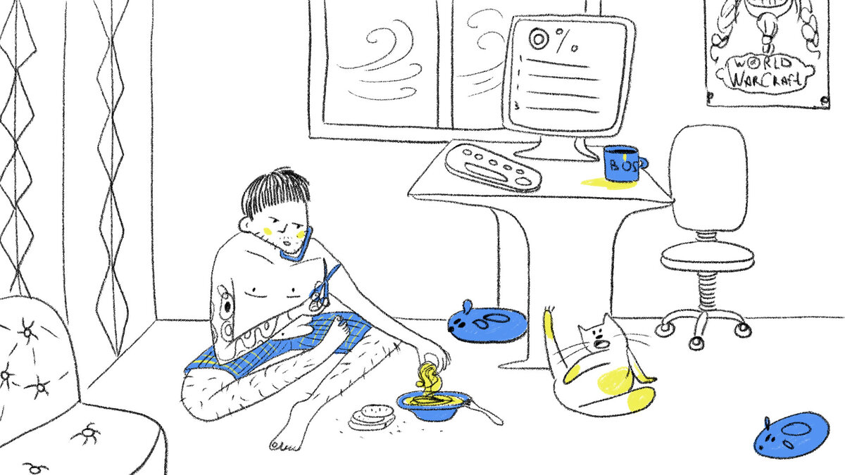 Плотный завтрак, сигаретка, пару стаканов кофе, и наш Петя готов анимировать пиксели. После плодотворных 8 часов работы, диджитал-герой отправляется на заслуженный отдых.