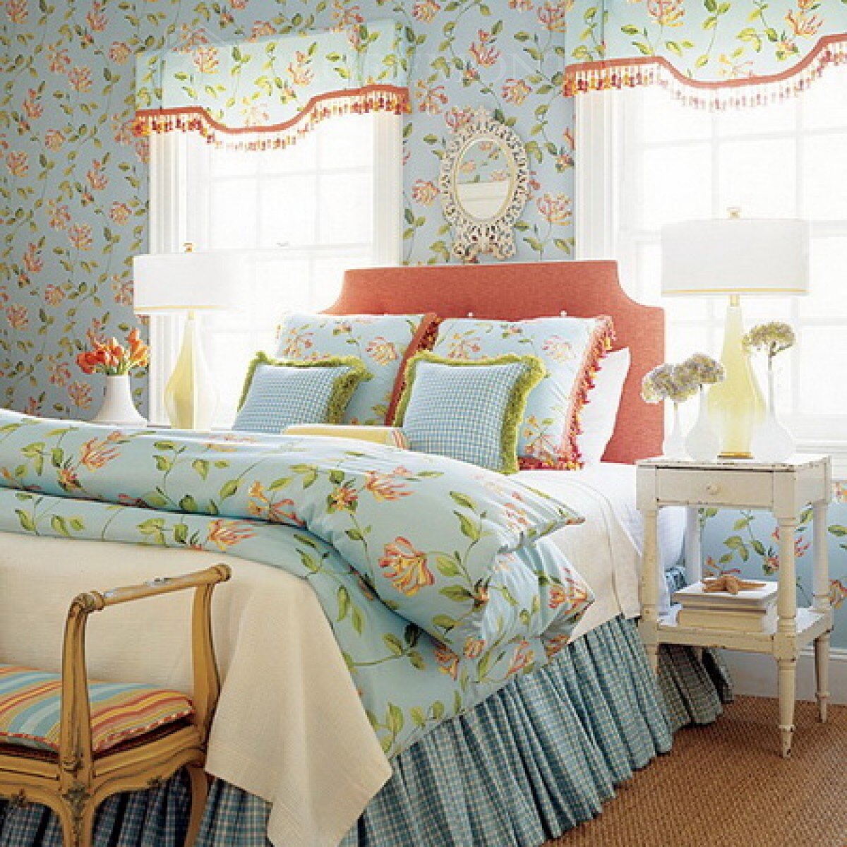 В светлом и солнечном интерьере, в стиле французского кантри важное значение в оформлении занимает текстиль. Романтичный и живописный, излучает ощущение исключительности, созданный руками человека и тот налет французского шарма, который придает интерьеру прованс особое очарование. Цветовая палитра и рисунок текстиля в стиле прованс Особенности текстиля в стиле прованс сложились еще в девятнадцатом веке, в то время развитая текстильная мануфактура предлагала на множество тканей: лен и батист, гобелены и ткани из шерсти, кружева и т.д. Рисунок в стиле прованс узнаваем – это романтичные цветы, клетка и полоска на молочно-белом фоне. Оттенки белого представлены обилием теплых вариаций – слоновая кость, кремовый, сливочный, ванильный, шампань, нежный персик. Цветовая палитра текстиля в стиле Прованс включает в себя множество оттенков. Нежные, чаще всего холодные, как сама природа provence это цвета – песочный и оливковый, розовый и алый, сиреневый, желтый и т.д. В цветочных мотивах тканей