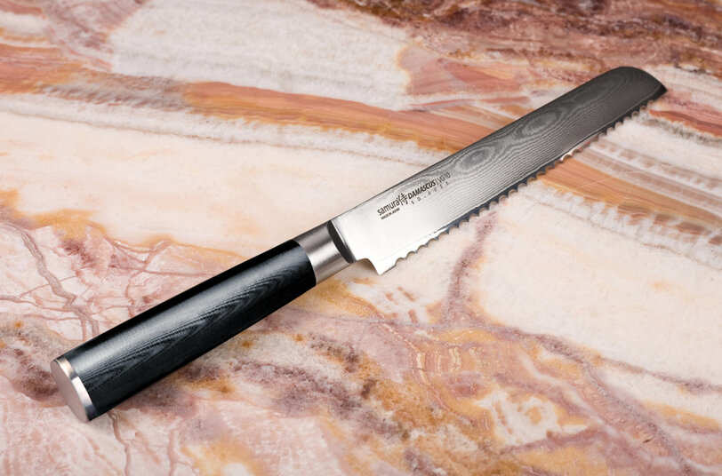 В первой части мы рассмотрели три классических, универсальных ножа, Chef, Utility и Pairing. Три обязательных инструмента при готовке. Во второй части будет парочка специализированных, так сказать, ножей, ножей с определенным назначением. И первым из них будет Нож для хлеба Специальный нож, который, можно, при желании, заменить, любым другим. Но только не в случае, когда под ножом лежит мягкий хлеб. Хлебный нож имеет длинное, широкое и прочное лезвие, или немного сужающееся к рукояти или одинаковой ширины по всей своей длине. Кончик лезвия не заострён, а закруглён или срезан под прямым углом к режущей кромке. Современные ножи для хлеба имеют волнообразную или зазубренную заточку, которая позволяет «распиливать» твёрдую хлебную корку и разрезать мякоть, не сминая её. Так-же этим ножом можно и нужно резать фрукты с твердой кожурой, но мягкой мякотью, например арбузы или дыни. А еще пиццу. Все любят пиццу. Но основная задача, конечно, это хлеб. Типичная длина 15-25 сантиметров, хотя